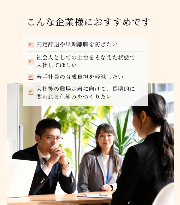 本プログラムは、インターン後から入社後まで、学生と企業をつなぎ続ける“定着支援型”の育成プランです。